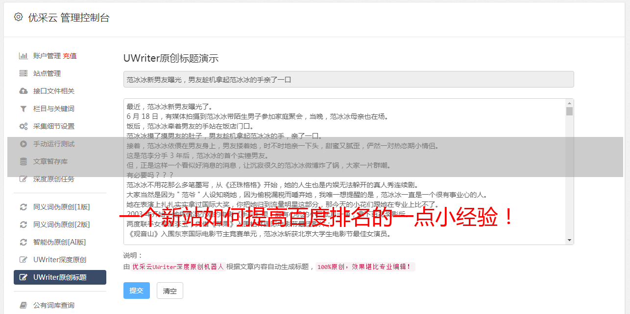 如果新站点布局合理,并且写了logo,则无需修改,防止进入沙箱。稿件应该每天更新,告诉他这个网站很多人都用百度搜索引擎每天进行维护。