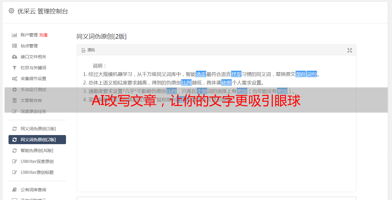 优采云 发布时间: 2024-02-08 07:35第一点:AI改写文章,让你的文字更吸引眼球!