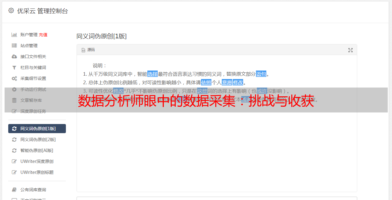 优采云 发布时间: 2024-02-09 01:38身为专业的数据分析师,我深深认识到数据采集的重要性。在这个数字化的时代里,数据被誉为新能源般的存在。这是我在职业历程中的一些有趣而难忘的经验分享给大家,希望能带领你们进入数据采集的奇妙世界。
