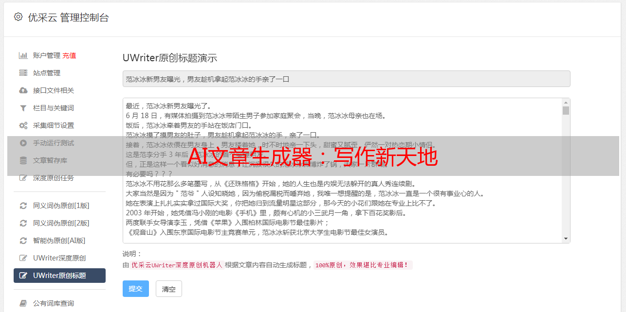这款AI文章*敏*感*词*界面设计得十分友好易懂,即便您对科技生疏,也能轻松上手使用。仅需输入关键字或选定主题,再轻轻按下生成按钮,就能快速获取一篇优质文章。