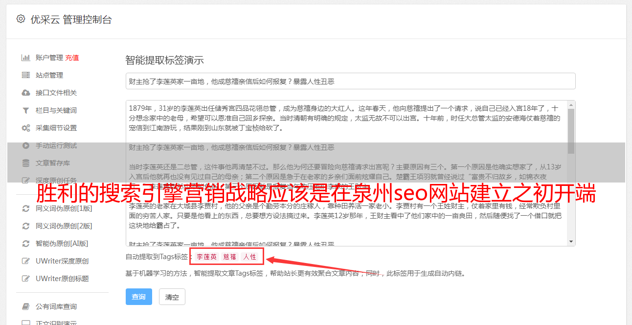 泉州seo搜索引擎优化策略胜利搜索引擎营销策略应该从泉州seo网站建之初开始,从域名的选择到网页源代码的开始,但目前的状态quo多是网站设,分工和流程都是把搜索引擎的优化工作放在最后网站曾建好了 提交给搜索引擎网站再做优化。这时候优化其实挺被动的,所以一开始就建议网站规划者在网站Established,提交给网页设计师、程序开发人员和内容编辑,有利于搜索的网站buildingment备忘录引擎排名现在介绍各种搜索引擎优化的方法 searchengineoptimationSEO 停止简明总结以下方法是google默认的,但是因为包括雅虎在内的大多数搜索引擎robot在索引网页时都遵循相同的主要标准,本文不讨论详细单独搜索引擎。允许搜索引擎尽可能多地捕获带有关键词 的文本。这些中心包括域名title和meta标签、文本链接文本文件名、altheader标签,即正文标题等。让你的关键词无处不在,但不要堆在同一个地方。更多关键词selection技巧 相关性是指定位人气控制太热,不容易排名太冷,没有人搜索2个域策略域名应该收录你的关键词并使用连字符-分别高亮关键词这样当搜索引擎承认,有专家认为域名收录关键字,排名效果小,但不能承认它是有效的。因此,它可以被视为一个整体。关键字域的使用。二级和三级域名显然没有竞争优势。 3 虚拟主机策略测试 共享IP地址网站目前多为多个中小型网站共享一个IP地址相同的虚拟主机。如果你与网站共享一个IP被搜索引擎惩罚会拖累你,你将无法登录搜索引擎。另外,因为一个IP往往有几百个网站,会影响你的网页下载速度,尤其是某些网站流量特别大的时候,如果搜索引擎抓取到某个页面,该页面就无法下载了半天。搜索机器人会抛弃他们,所以除了了解有多少与你共享IP的网站可以受到惩罚外,最好了解他们的一般流量情况。如果情况不好,尽快更换主机。另外,搜索引擎不愿意收录免费网站甚至收录首页空间也很难有好的排名工具来推荐泉州SEO。专注于SEO优化和SEM营销。通过域名了解您的 IP 地址。通过IP地址知道你的IP地址。分享网站的号码和地址。网页文件目录策略 有序、合理地排列文件。文件目录结构的标准命名很简单。 网站 最多可以显示三个级别。重要的内容放在顶级目录中。文件夹名收录关键词,HTML网页文件名也收录关键词图片文文件也收录关键词 这里提到的关键词主要是为了详细的页面内容。文件名是一个短语。使用破折号或下划线分隔的标准做法是使用英文而不是拼音字母。文件和css文件放在js和css外部文件中。这样做的好处是将重要的页面内容放在页面顶部,减小文件大小,有利于搜索引擎快速准确的抓取页面的重要内容。其他字体和格式 尽可能少地使用搜索引擎。喜欢在页面开头找到页面的关键内容。 6 动态策略动态页面是由ASPPHPCGI等程序动态生成的页面,需要提交用户输入条件才能生成。