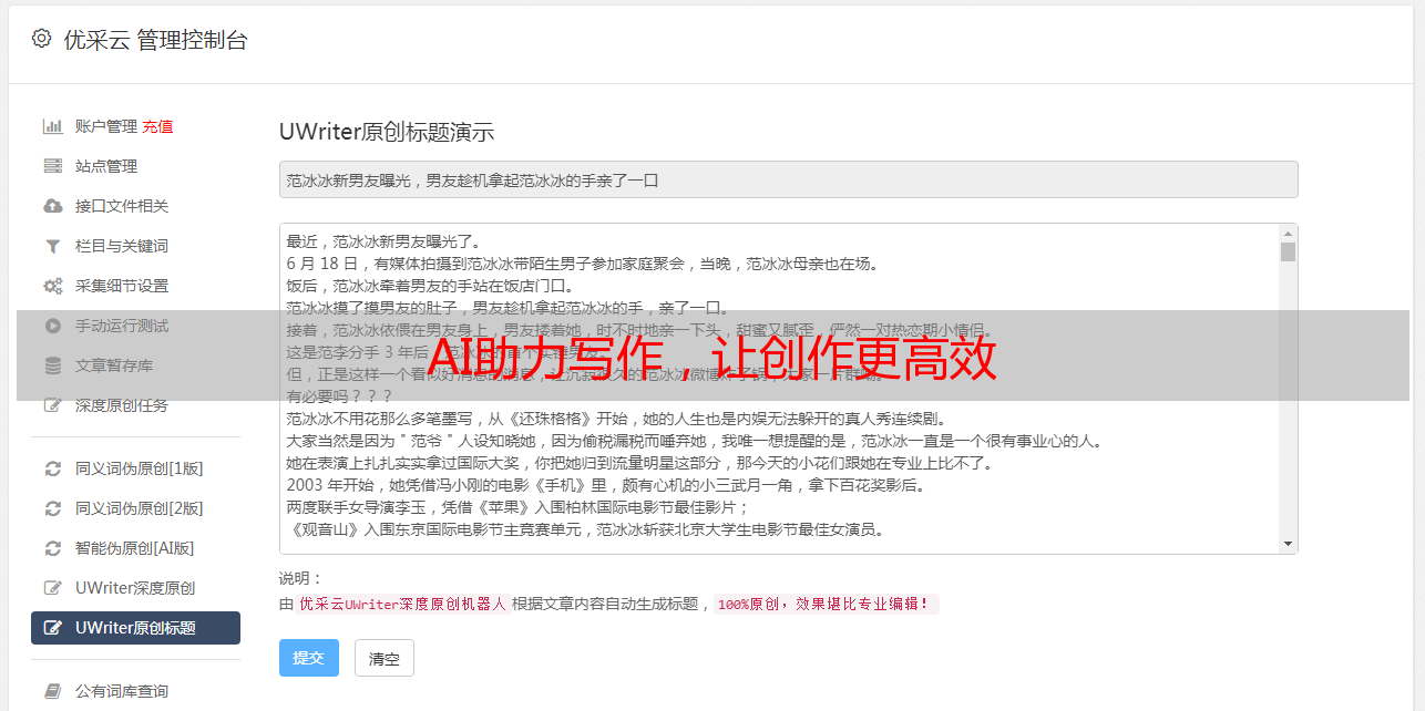 AI写作*敏*感*词*不仅能为您创作新的内容,也能优化您已有的文章。它能根据您的输入内容来自动调整段落结构、字体格式以及如何更好地呈现标题等细节,使您的文章更加精美,更易于阅读。