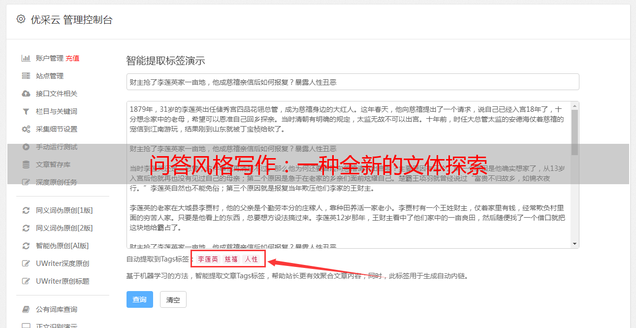 优采云 发布时间: 2024-02-13 19:51亲爱的读者,我们为您推荐一款实用神器——AI文章生成助手。本篇文章,我们将从该软件的角度出发,回答有关“问答式写作”的常见问题。