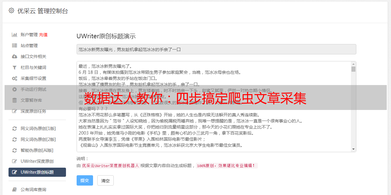 持续提升、优化爬虫批量原创文章采集技巧,是一种成长过程。请您保持学习热情,紧跟科技脉动与业界动态。唯有不断精进、完善自我,方能在这一广阔天地立于不败之地。