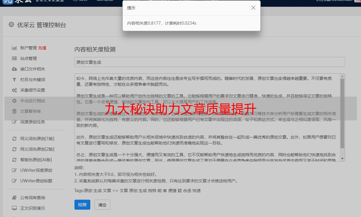 掌握关键词自动采集技术,能助您提升内容推广效果,并有效提高文章质素及影响力哦。通过运用上述九大关键技巧,相信您定能雕琢出更有魅力的作品,吸引更多读者们的喜爱与关注呢!