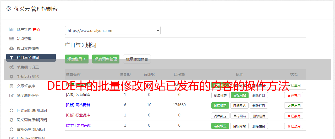 DEDE批量修改网站内容的步骤:进入后台,点击左侧采集,点击批量维护或后台的数据库内容替换,上半部分要有辅助功能,以及批量维护的数据库内容替换。