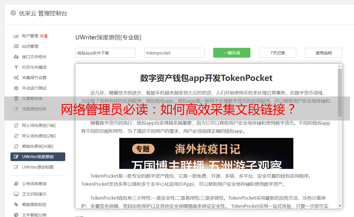 优采云 发布时间: 2024-02-25 09:56本人作为一位网络管理员,存有丰富的从采撷文段链接的现实经验。此文中,尽述自身在处理这个领域难题时所取得的心得以及实用窍门。相信,无论身为研究员、莘莘学子抑或自由笔耕者,都能从中获益不少。