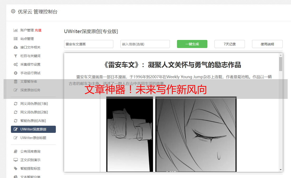 优采云 发布时间: 2024-02-25 15:53身为一位经验丰富的作者,我常服务于各个媒体撰写各类文章,近期,我有幸接触到一种新颖而令人兴奋的写作方式——“文章智能AI伪原创”,对于未来的写作方式,我充满期待与好奇。