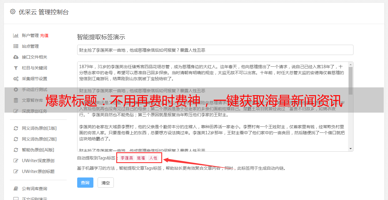 无论是追踪重大事件还是在特定领域检索文献,织梦采集今日头条将帮您快捷地找到所需资讯。您只需输入关键词并设定筛选条件,系统即可精准地呈现出满足要求的文章,让查找信息不再繁琐复杂,让您更加便捷地获取所需的信息资源。