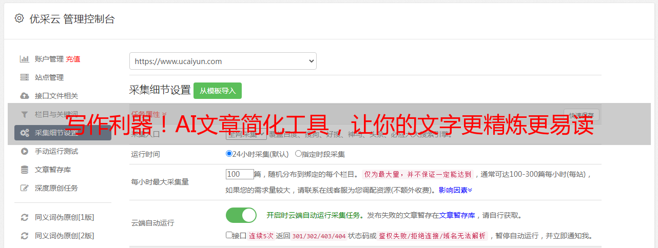 优采云 发布时间: 2024-02-26 07:27亲爱的读者朋友们,您好!我是小李,一位专注于科技领域的资深记者。本期我为您带来一款风靡一时的AI文章简化工具。此款工具宣称可助力用户大幅提高写作速度和质量,使文章精简明了。那么,其使用方法与效果究竟如何呢?请跟随我的解读,一探究竟吧!