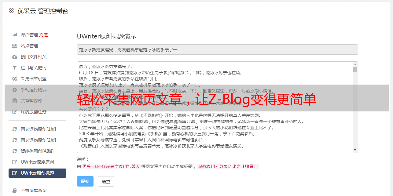 优采云 发布时间: 2024-02-28 00:50对于如何将网页文章收集至Z-Blog上这个问题,相信很多有意在博客上发布优质内容的博主都会关注。以下,我将为大家分享几个方便实用的办法,以助各位轻松完成此操作。