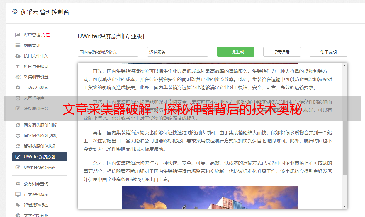 成功解除文章采集器的限制,是我对科技创新应用于实际场景的一次宝贵体验。在这个过程中,我深化了对技术与道德、便利与责任间关系的认知,理解到如何以正当方式运用技术才能实现最大利益,为社会创造更大价值。