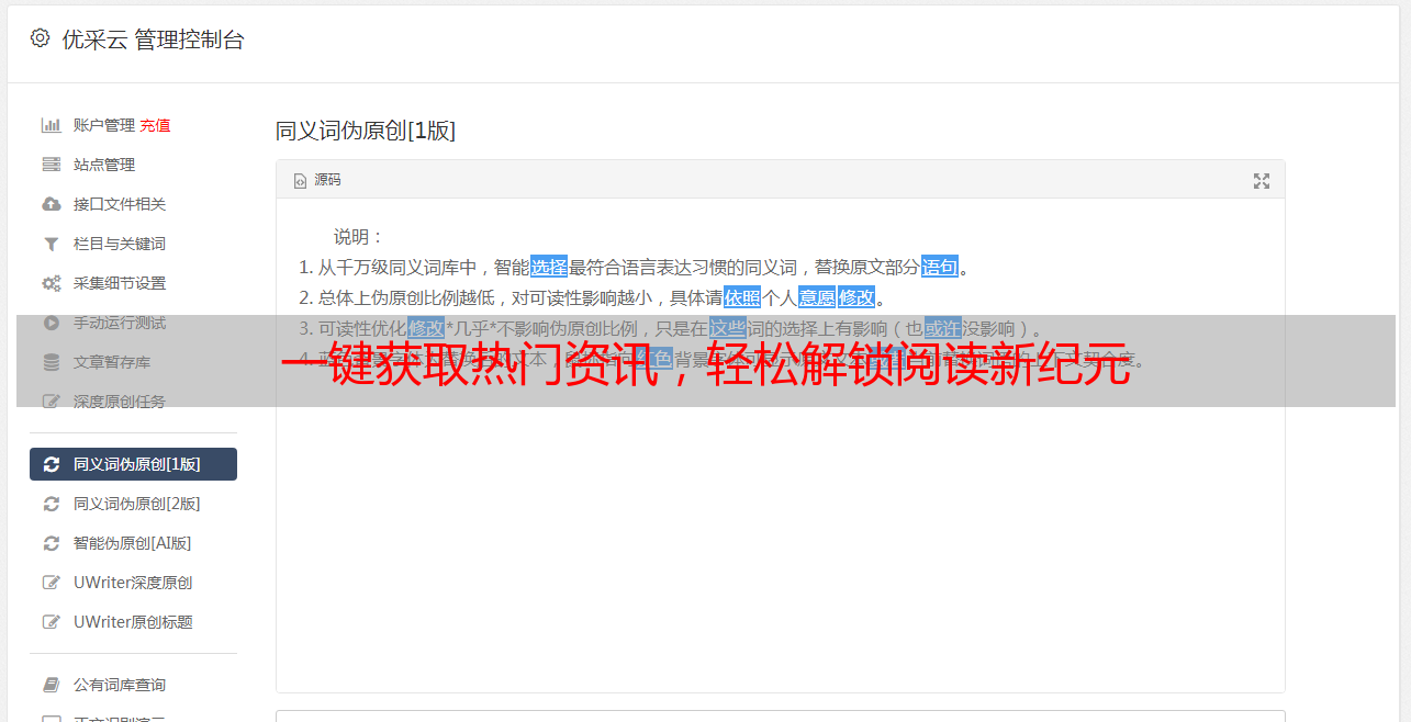随着科技发展步入信息时代,我们对最新、精彩且富有价值的信息提出了更高的要求。例如,作为一位独立开发者,我致力于打造一款便捷易用的工具,以助您轻松捕捉热点资讯。历经多轮反复开发,基于持续不断的努力与付出,我方有幸推出全新的作品——《热门文章采集器网页版》。本软件将引领用户进入前所未有的阅读新纪元。