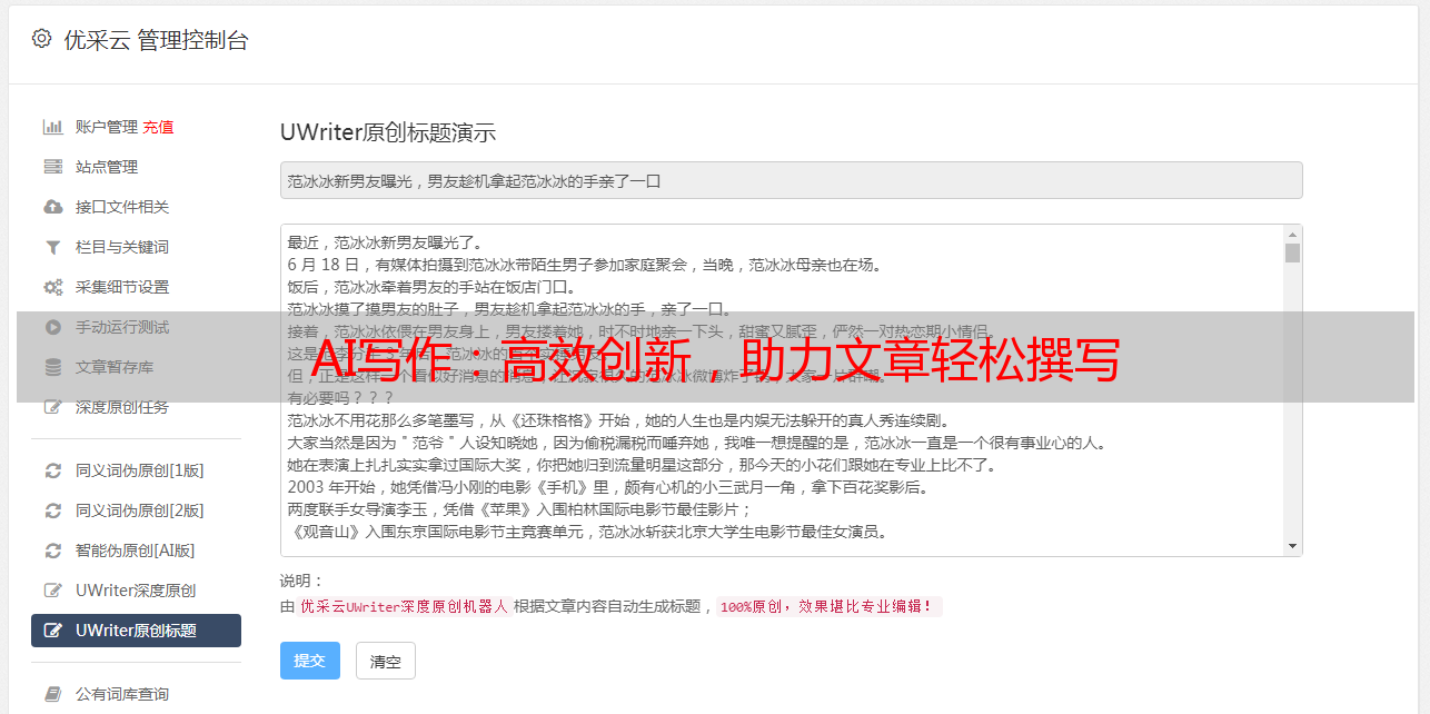 优采云 发布时间: 2024-02-29 04:58随着信息化浪潮的不断推进,写作已然成为必备技能之一。然而,对于部分群体而言,撰写文章却仍存在诸多难度和挑战。故而,是否存在一种便捷且高效的方式来助力我们创作出高质量文章?这一问题的答案无疑是肯定的。在此,本人有幸为广大读者推介一种崭新的写作模式——人工智能(AI)写作。