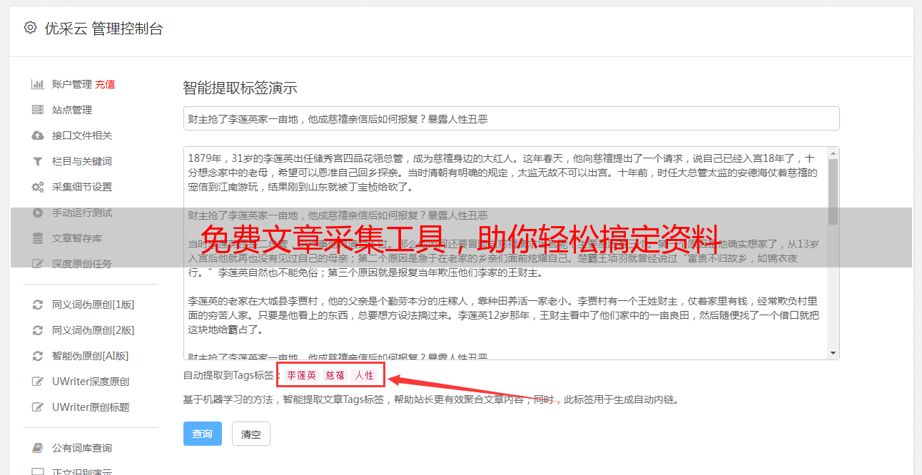 优采云 发布时间: 2024-02-29 09:41随着互联网时代的深入发展,免费文章采集工具已逐渐成为了很多人日常工作中必不可少的辅助工具。这类工具不仅能帮助我们更高效地获取所需信息,还可为我们的创作带来丰富的灵感与素材来源。以下是本文为各位整理的有关免费文章采集工具主题的相关资讯。