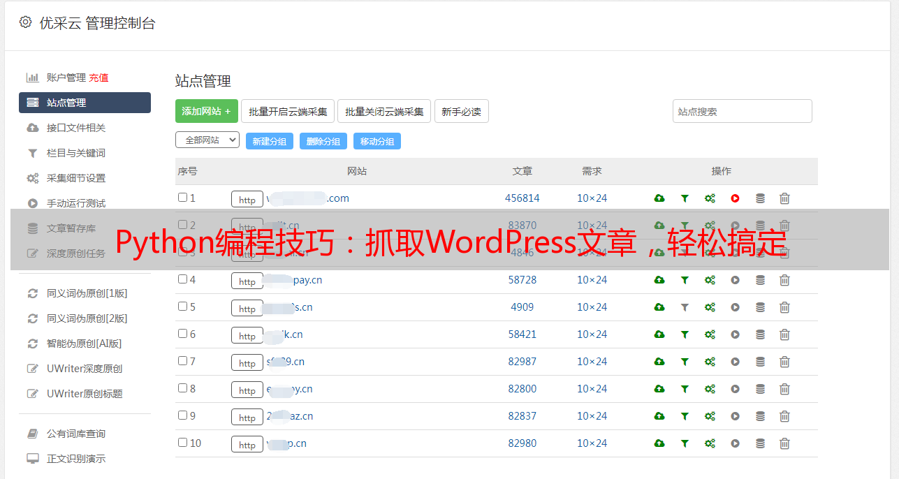 优采云 发布时间: 2024-03-01 17:35抓取WordPress文章的编码技术是一项颇具价值的技巧,特别在对WordPress网站中大量文章进行信息采集时显得尤为重要。无论是开发人员、数据工程师或是内容制作大师,熟练掌握此项技能均可为日常工作带来显著便捷。这里将详尽阐述如何运用Python编程技术完成WordPress文章的抓取。