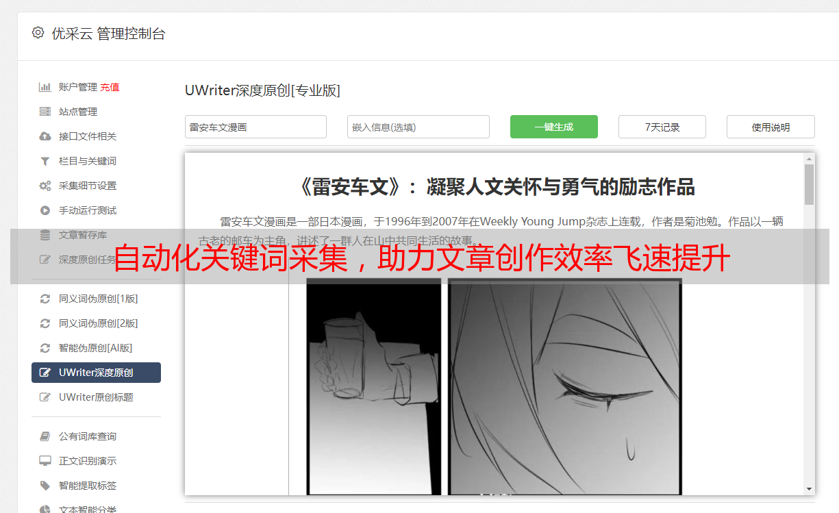 优采云 发布时间: 2024-03-02 11:36伴随着互联网的飞速发展,内容创造变得尤为关键。其中,搜寻并发表相关文章中的关键词过程复杂且耗时而令人困扰。然而,运用自动化技术进行关键词采集及文章发表,可显著提升工作量和工作效率。本文,笔者愿分享关于自动化采集关键词并发布文章的心得体会。