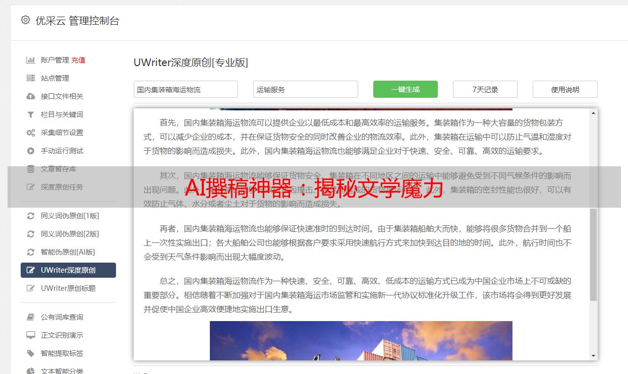 优采云 发布时间: 2024-03-02 14:17在我这个文化行业的"魔术师"手中握有一个强大的写作魔力器--这种堪称ai自动写作神器的软件已经得到了广泛认可和赞誉。在此,我希望能为您揭开这一秘密工具所蕴含的无穷魅力。