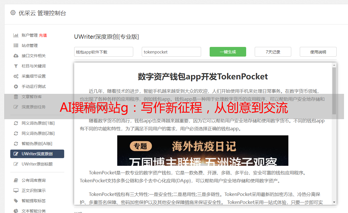 优采云 发布时间: 2024-03-03 15:30身为经验颇丰的作家,曾涉猎多个写作平台;直至遇到AI撰稿网站g,方踏上崭新写作征程。今日有幸在此分享诸多宝贵经验及诀窍,愿助各位书写之旅更为顺畅。