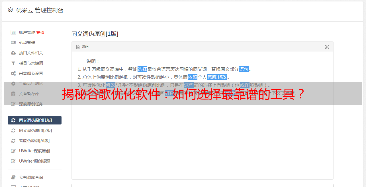 优采云 发布时间: 2024-03-04 05:47身为资深SEO专家,我始终探寻提升网站排名的高效工具。在此过程中,我通过深入研究与对比测评,筛选出可信赖的谷歌优化采集软件。在此篇文章中,我将公开我的研究成果,协助您作出明智的选择。