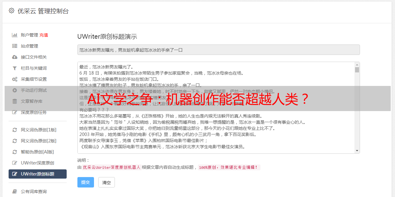 优采云 发布时间: 2024-03-05 08:37近年来,人工智能(AI)技术高速发展备受关注。当我们探讨其潜力时,AI是否能够创造出高质量的文本艺术作品成为一个颇具争议的话题。身为该领域专家,我将为阁下深入解答这一问题。