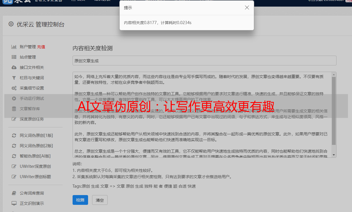 优采云 发布时间: 2024-03-07 01:53近期,我有机会亲身试用一种影响深远的科技产品——智能AI文章伪原创。身为资深文字工作者,我对这种创新写作手法充满好奇。在此,我将与各位共享这段体验及其效果评估。
