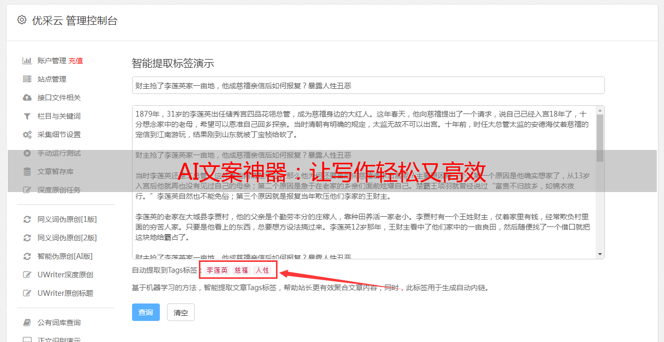 优采云 发布时间: 2024-03-08 15:33身为专业作家,每日需处理繁重文本编辑工作,难免困惑难解。近期发现一款卓越工具——AI文案自动生成神器,使写作生涯焕然一新。