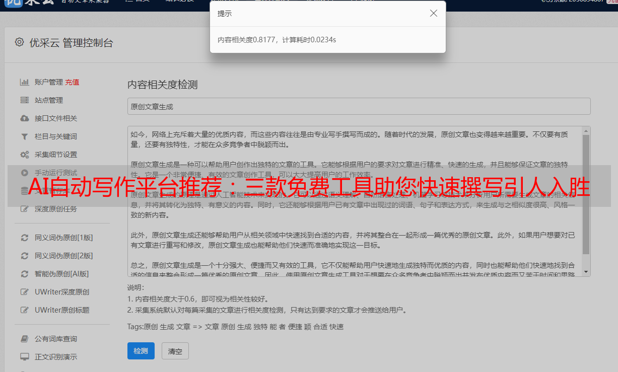 优采云 发布时间: 2024-03-12 00:48随着先进科技的崛起,AI自动写作平台逐渐进入大众视线。依托强大的算法和丰富的数据资源,为用户提供高效优质的文本生成服务。在此,谨向广大读者推荐数款实用且免费的AI自动写作工具,以期对您有所助益。