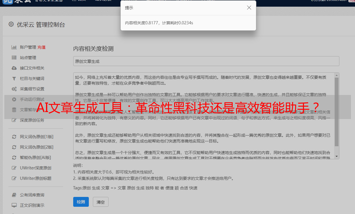 优采云 发布时间: 2024-03-12 06:47人工智能驱动的产品逐渐渗透于大众日常生活中,包括了AI文章自动生成工具等高新技术。其具有的神秘感引发公众广泛关注,那么,这类工具到底是革命性的黑科技还是高效的智能助手呢?以下便是本文对其深入探讨的篇章。