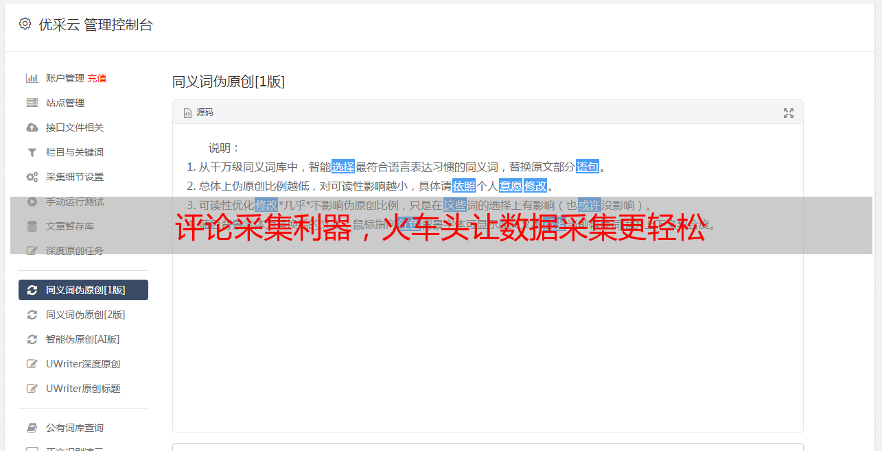 优采云 发布时间: 2024-03-12 09:47在众多采集工具中,火车头是我最为钟爱的一款之一。这款软件能助我迅速精准地捕获到大量存在价值的文章评论,身为资深传媒人,我深知评论文本对文章质量与影响的深远意义。由此可见,高效实用的采集工具有多么关键于我的职业生涯。
