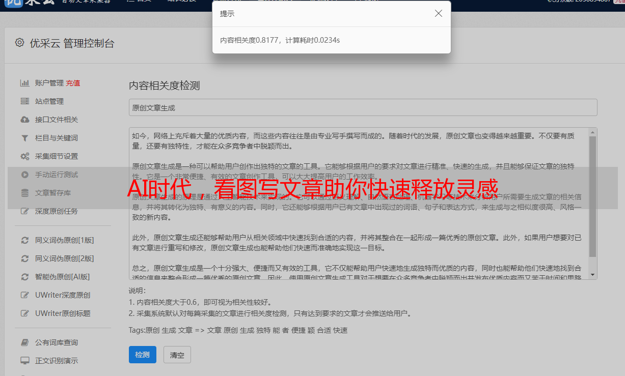 优采云 发布时间: 2024-03-12 17:53随着数字化技术日益完善,人工智能已深入人们日常生活的各个层面。近期,本人有幸试用了一款名为“看图写文章AI”的工具产品,确实收获颇丰。接下来,乘此机会向各位详细描述一番这一次的使用心得。