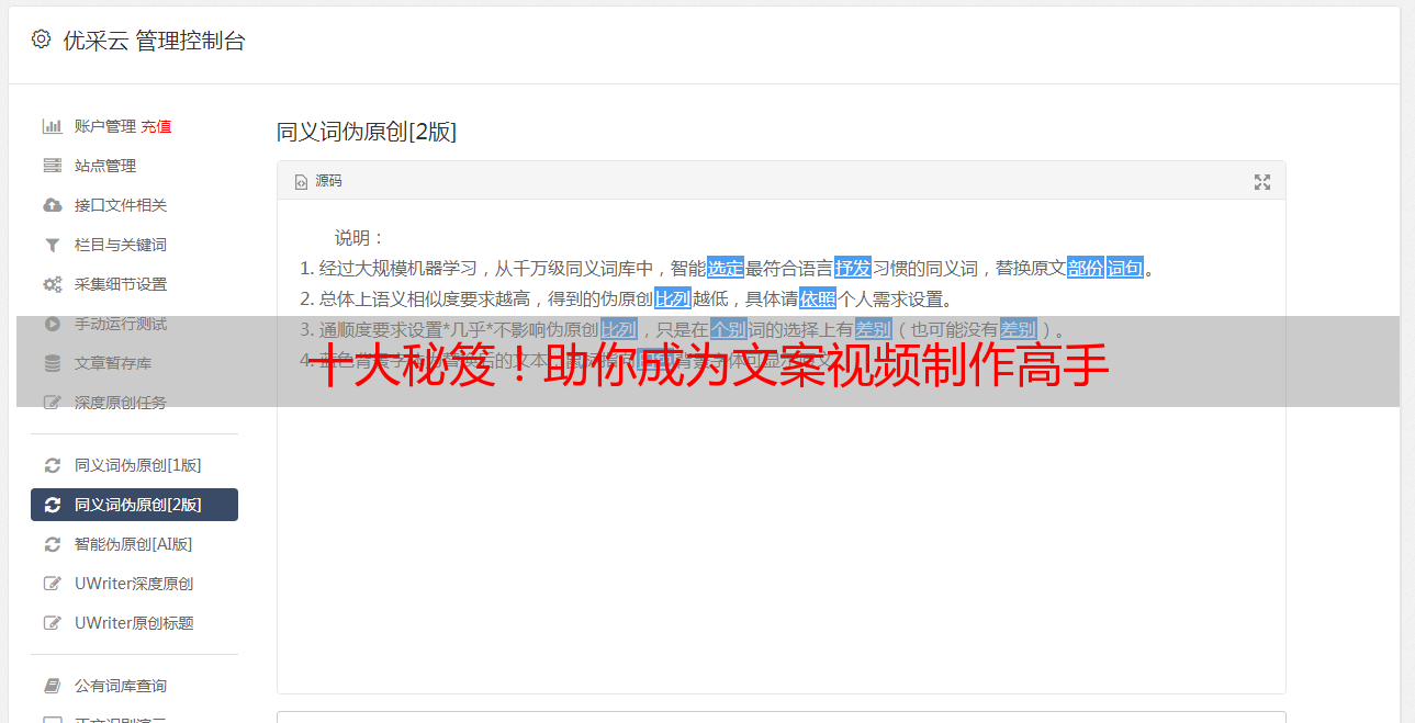优采云 发布时间: 2024-03-13 01:25文案视频作为一种高效的营销手段,能精准地触达并留住受众群体,传递出产品或服务的核心价值。本文将在下文中分享本人的宝贵经验,总结出十大要点,助力各界人士提升文案视频制作水平。