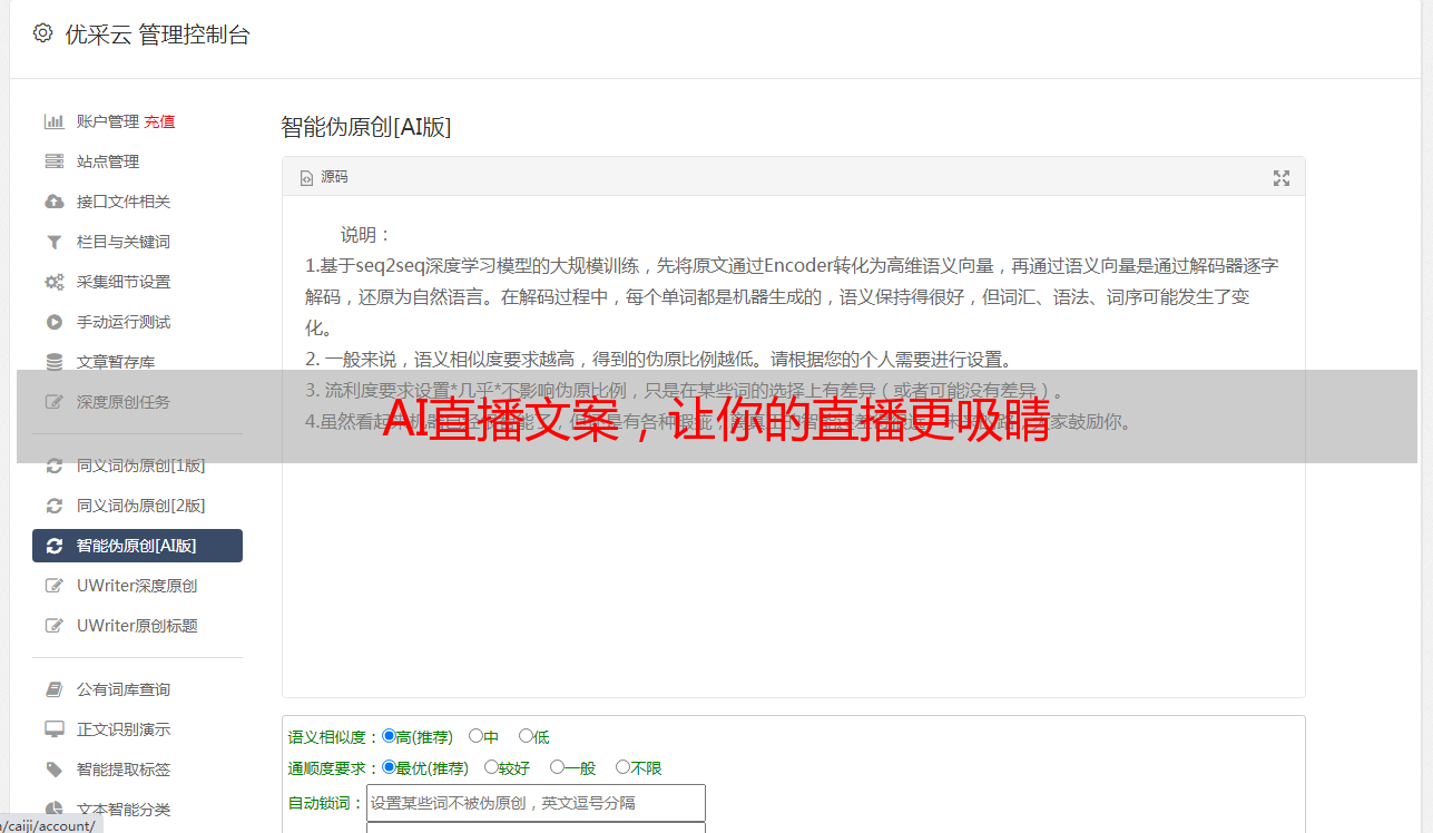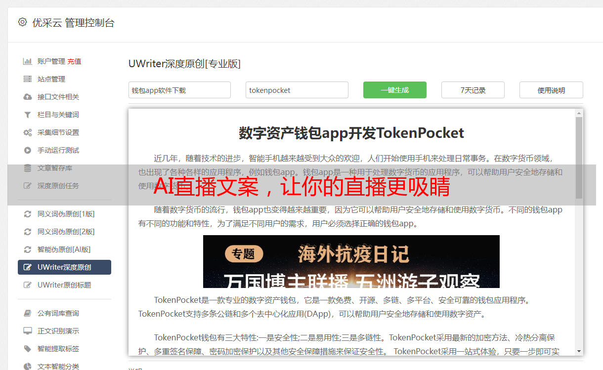优采云 发布时间: 2024-03-14 02:22伴随着科技日新月异,人工智能(AI)横扫各行各业。在媒体领域,AI的重要性越发凸显。近期,一种名为“AI创作直播文案”的创新技术受到了强烈的瞩目。这项技术以AI算法分析海量数据,生成精准且高效的直播内容。