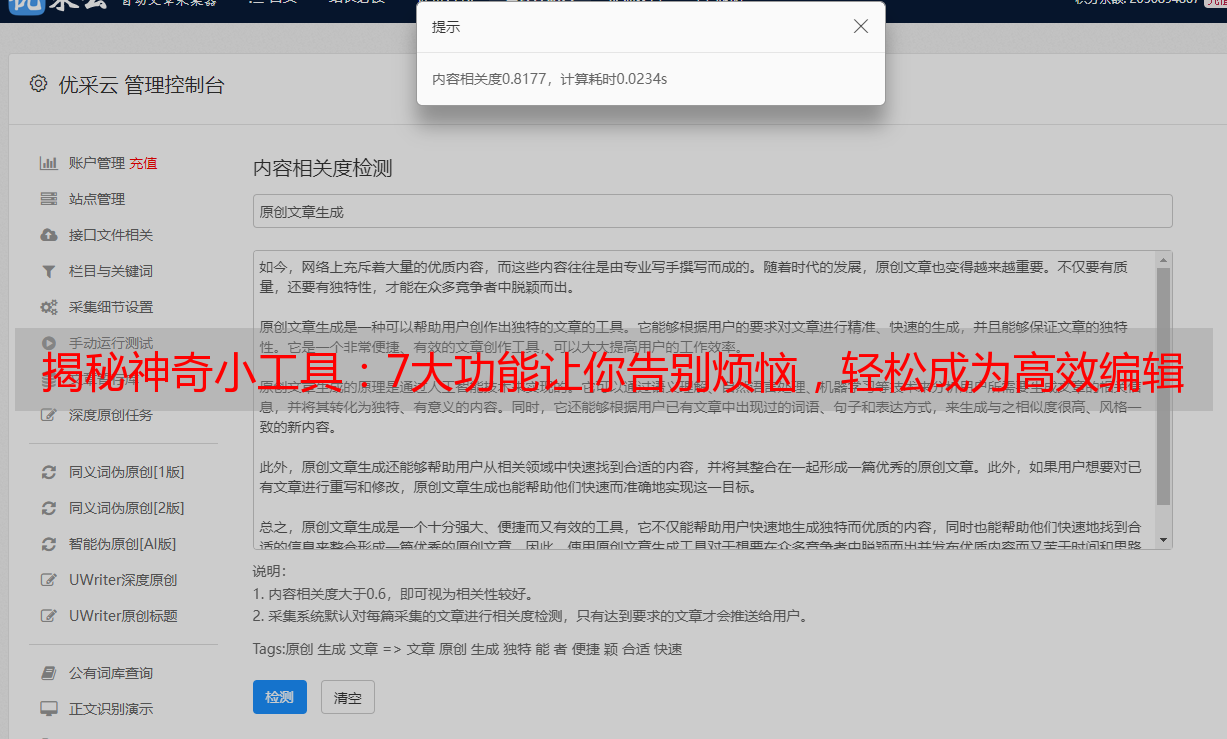 此款小工具可为您快速收集各类文本,包括互联网以及个人感兴趣的书籍、期刊等。通过简易设置关键词及来源,系统将自动搜寻相应内容,形成完整的文章,让您不再为寻找素材而烦恼。