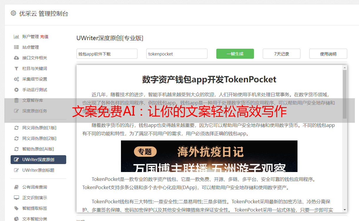 优采云 发布时间: 2024-03-14 21:49随着数字化进程的不断深入,对高效智能化工具的追求逐渐成为常态。身为一位市场营销的从业者,我一直在寻找能够提升工作效能的法宝。近来,我体验到了"文案免费ai"智能写作工具的强大功能,其独树一帜的功能使我的工作模式发生实质性的变化。