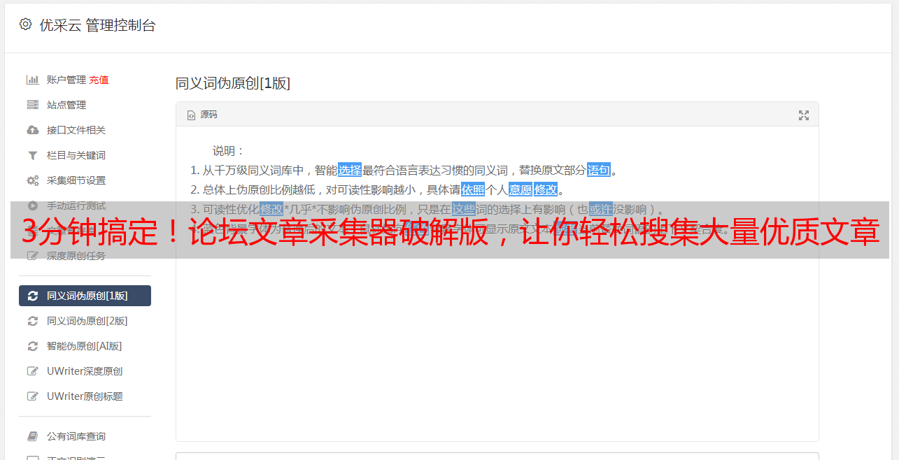 优采云 发布时间: 2024-03-16 01:58身为一位专业的网络编辑,笔者近期有幸亲自试用了广受瞩目的论坛文章采集器破解版本。在此过程中,笔者得以探寻并深度解析这款工具的神奇之处,在极短的时间内大量收集到了优质的论坛文章资源。以下,以专业简练的笔触,为您介绍笔者亲历之感。