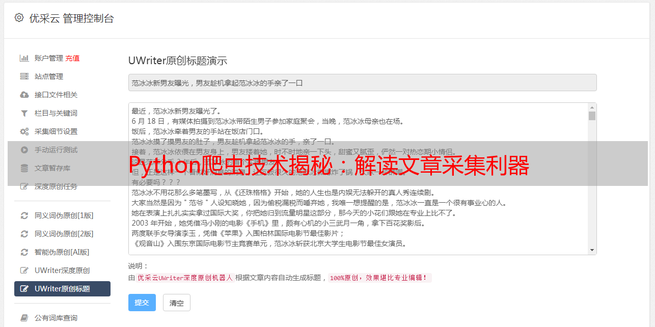 优采云 发布时间: 2024-03-16 13:36借助Python爬虫技术,我们能有效地搜集到海量网络文章资源。本人身为资深数据分析师,在此就爬虫在采集文章方面的常见问题进行详细解读。
