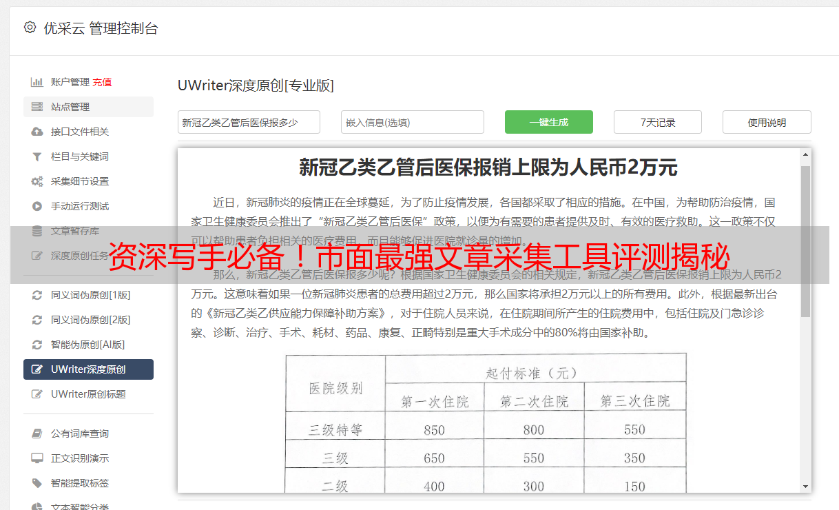 优采云 发布时间: 2024-03-16 16:24身为资深写作人,我常需搜集各种优质文稿。为此,我试用且评估市场多款文摘工具,其中,dede文章采集规则以优异表现胜出,遂为我所选用。