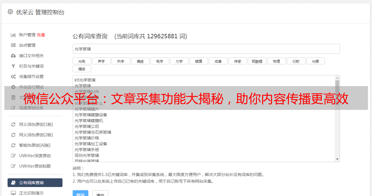 优采云 发布时间: 2024-03-18 07:33微信公众平台是重要的信息传播渠道之一,被众多企业及个体视为宝贵资源。下面我们将详细介绍如何运用文章采集功能,助您更高效地进行内容的管理以及传播工作。
