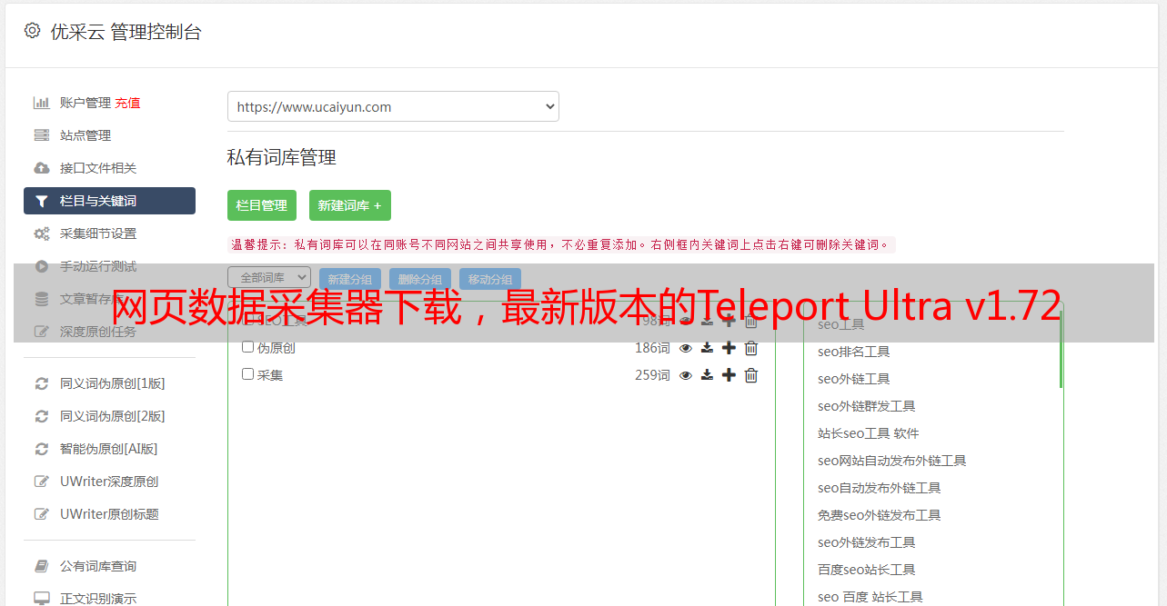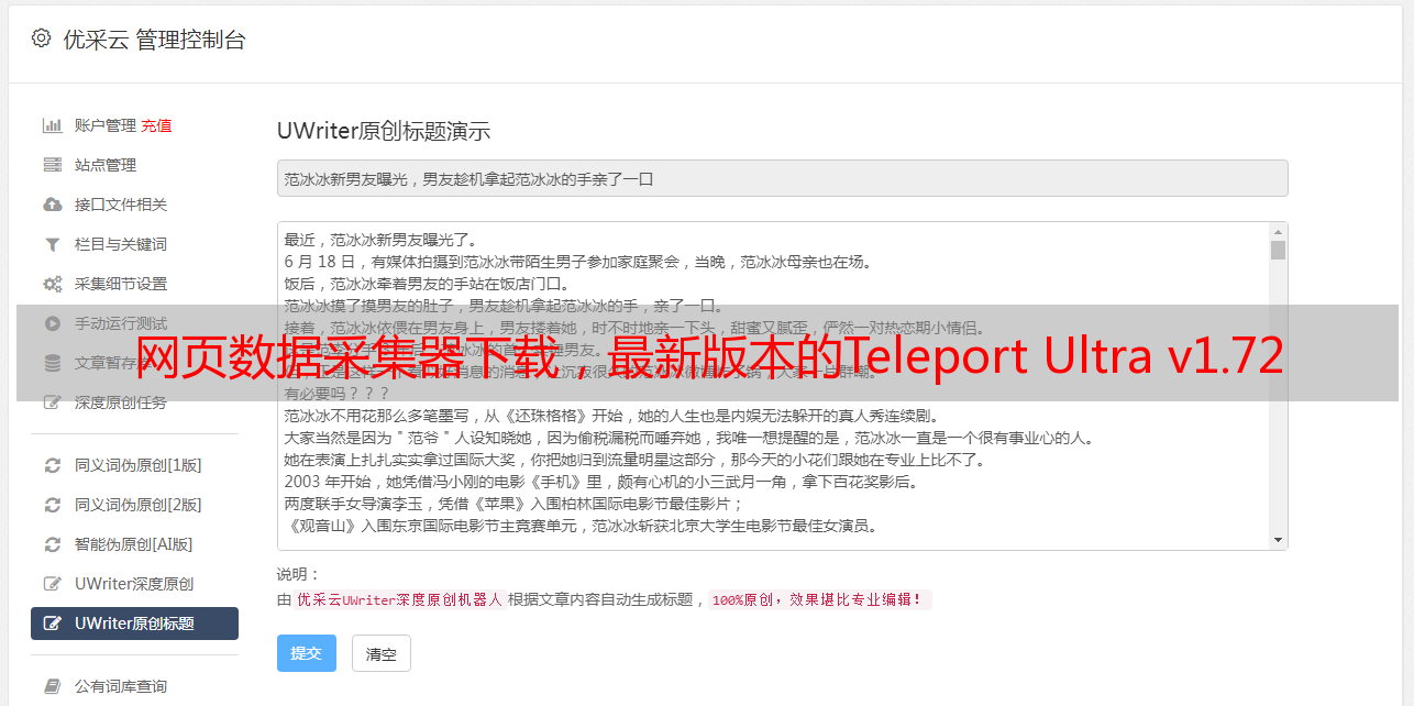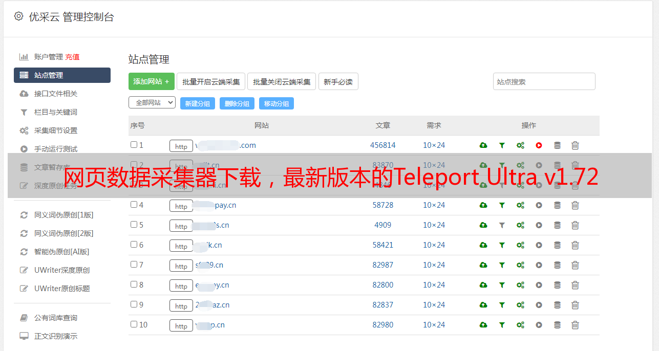 优采云 发布时间: 2020-08-08 17:47Teleport Ultra是一个Web数据采集器,您可以将其用作采集器软件. 它的功能非常强大,可以扫描数十万个地址并处理一个项目中的多台服务器,从而可以提高吞吐量,效果非常明显. 有兴趣的用户可以下载并尝试.