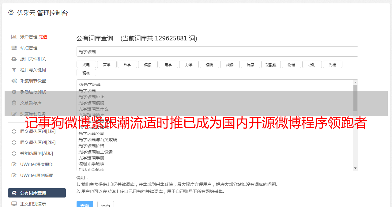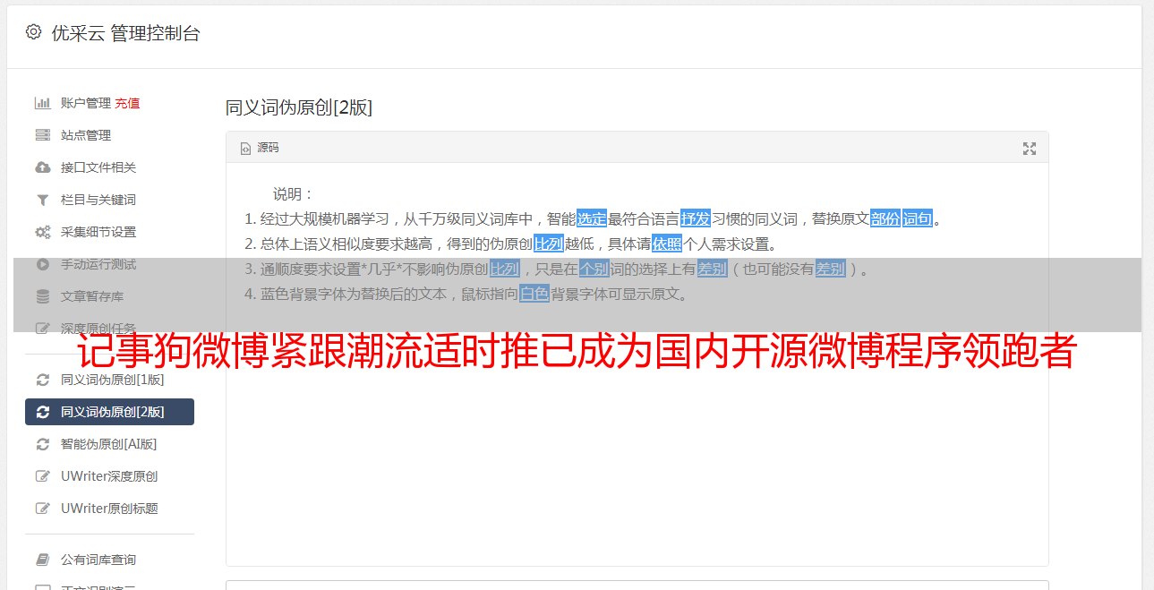 地址adminphp访问网站后台,根据提示登录。对于暂时不熟悉该文件的站长,可以下载安装以下软件,在本地进行测试操作。最好使用专用浏览器进行测试。运行easyPHP后,浏览器登录httplocalhostjsg21 一般设置 首先,登录账号下面的后台管理。登录后,会显示下图。输入帐户和密码。 Notedog系统 30 后台操作展示 211 核心设置 右上角有我们的客服QQ,方便随时咨询Notedog客服①。关闭网站 您可以通过输入任何内容来关闭网站②。开启二级密码验证。如果你经常使用网吧,你可以打开它。下图为关闭后台后的情况。如果不小心关闭了,可以直接从httptjishigounetadminphp返回管理员等待界面进行修改。下图是设置默认对话框后的效果①。是否开启wap手机访问建议开启②。建议打开视频站点进行播放。可以在此处选择用户区域。 1 发布时间设置可以很好地控制。 2 服务器时间设置以实际情况为准。国内是GMT8003网站名微博名1页gzip压缩可以适当加快网站访问速度2.备案号如浙ICP备06012684号 1.本站版权信息PoweredbyJishiGou200©2005-2010CenworInc2.可以在51cnzz等统计代码中添加统计信息。 3 网站底部会显示网站版权信息和统计信息。邀请注册 选择您是否必须拥有邀请码才能继续进行会员注册。邀请连接数设置为0,可以关闭邀请注册,开始水印设置。默认水印地址是imageswatermarkpng。图片上传后,可以在注册界面和登录界面选择添加水印地址,防止灌水。设置 212 界面和显示设置。顶部导航设置如下图所示。在后台设置相应的操作说明。删除导航。 2 选择打开方式。选择此窗口可从当前网页跳转到指定网页。选择新网页以打开新窗口导航。新增213默认关注和推荐,可以在对应的对话框中输入对应的默认关注用户和推荐用户关注,按提交保存,邀请设置比较简单,无需复述214微薄的外呼即可直接在其他网站 微博上显示的信息就像新浪的挂件。单击以添加要添加的异地呼叫。下面是设置界面。 1 调用描述可以是站点外的名称描述来区分。微博公告提交后不再详述内容。微博首页显示的公告标题内容支持新浪微博HTML生成设置。 QQ机器人的设置。手机短信设置。以下提示都很简单易懂。您可以搜索所有微博,搜索结果会显示在下方,然后重新编辑删除相应的微博。 216 推荐话题 推荐话题必须是微博中已有的话题。你可以自己发一条微博,设置一个新的。添加主题以设置新主题。主题推荐和排序可以在主题推荐中设置。排序在首页右侧以相反的顺序显示。 2 排在排序 1 的主题下。主题标题中的新主题也应该存在。然后对新主题进行更详细的描述。编辑成功后,可以进行相关的详细设置。 217 内页幻灯片设置如下所示。 217 内容过滤设置 在此设置过滤机制,避免非法词。您可以向主机提供商报告或机房管理要求将其非法词过滤列表添加到其中。如果访问过滤设置中出现关键词类似数量的非法内容,请到“settingfilterphp”删除相关字词,这里可以是空格