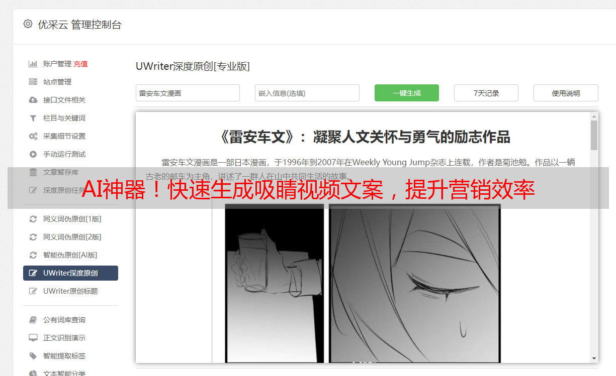 首先,让我们简单介绍一下优采云这款AI生成视频文案工具。优采云是一款基于人工智能技术的在线视频文案生成工具,通过强大的自然语言处理和深度学习算法,能够快速分析视频内容,并生成与之匹配的精彩文案。无论是产品宣传、品牌推广还是营销活动,优采云都可以帮助用户轻松生成引人注目的视频文案,极大地提升了营销效率和效果。
