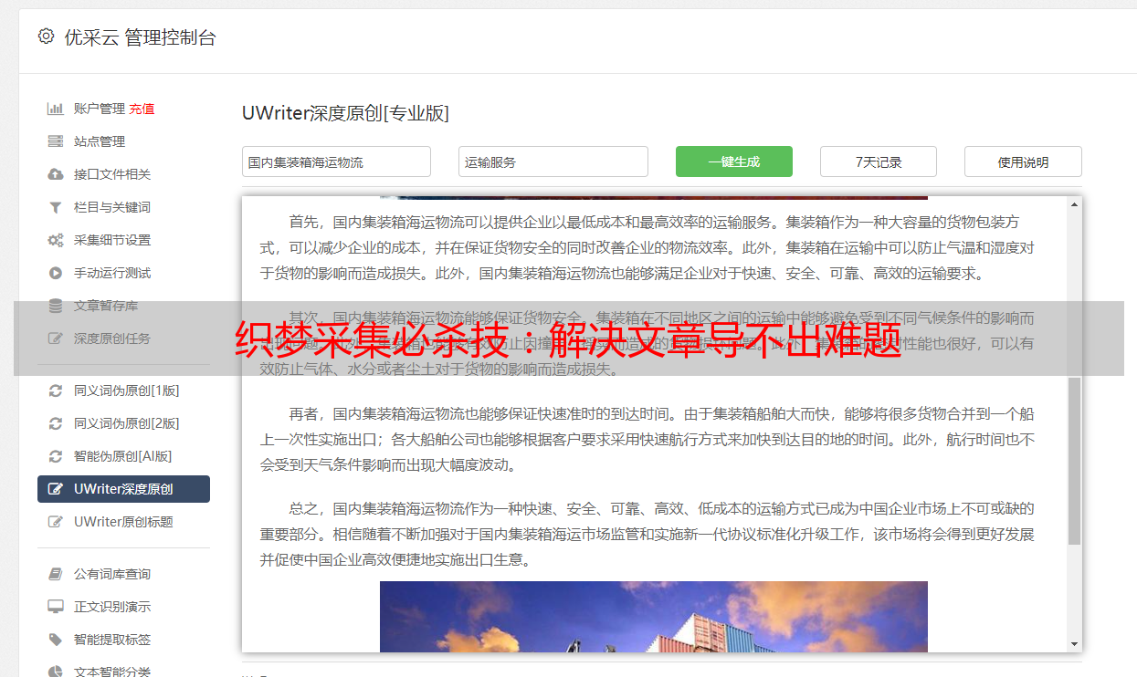 优采云,作为专注于网站内容管理的专业系统,成为便于用户实现网站建设与管理的得力助手。其中,织梦采集为其核心功能之一,助用户迅速攫取网络文章素材。然而,使用过程中可能因文章无法导出而干扰用户,以下将披露一些有关优采云的实用性建议及窍门,以便用户更高效地运用此强大工具。