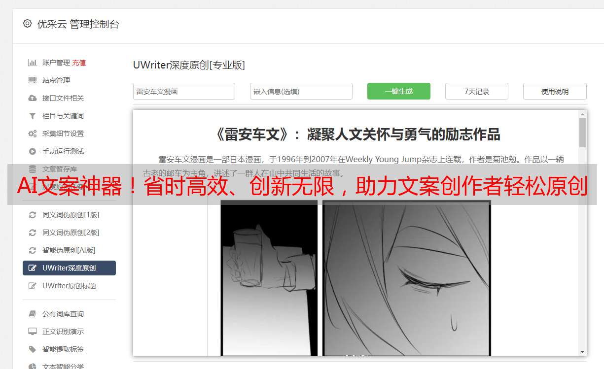 原创性保证:优采云AI原创文稿*敏*感*词*依靠深度学习实现独创性写作,为您提供原创且独特的文案。
