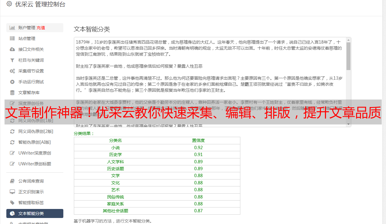 优采云 发布时间: 2024-04-05 16:58优采云是一款专攻文章采集与生成的应用,其先进的创作工具能助力用户快捷地完成采集、分类及编辑工作。本文将详细阐述如何运用优采云这个强大工具提升文章制作效率。