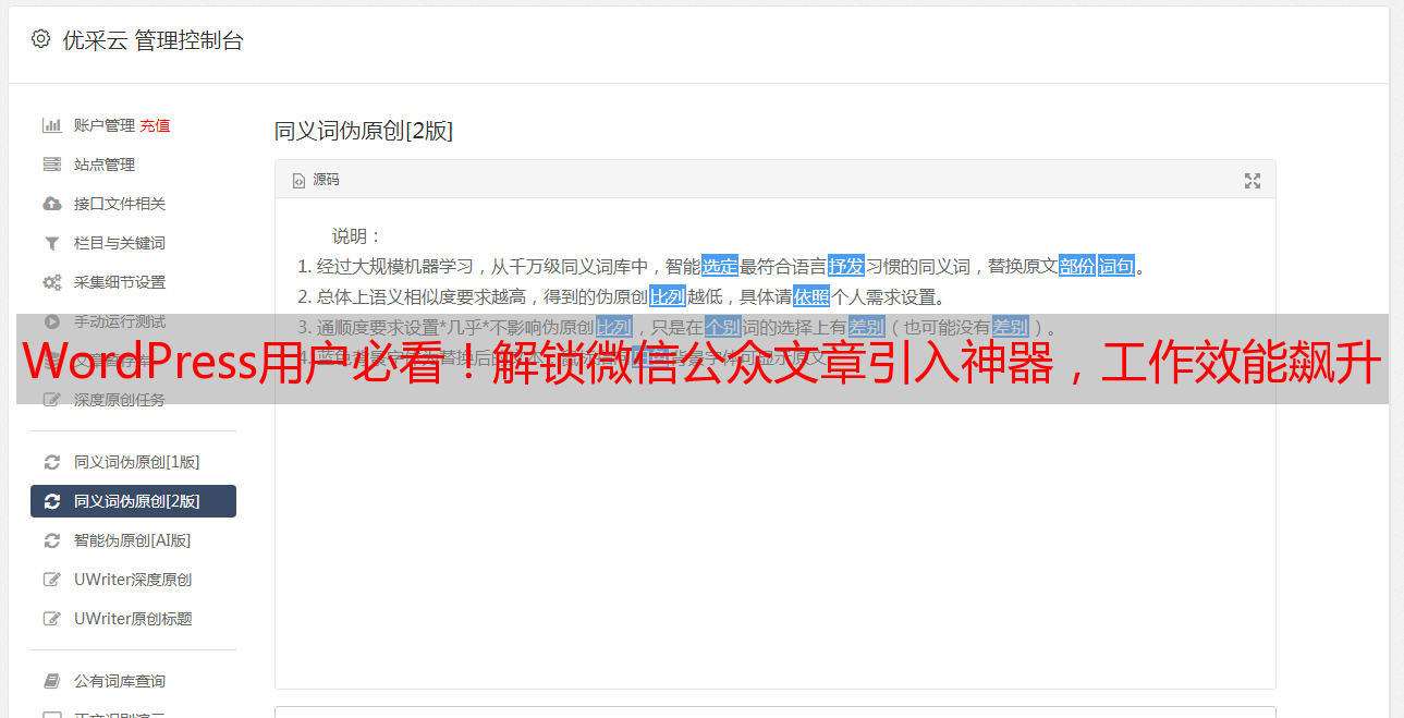 优采云,作为专为WordPress使用者所打造的微信公众号文章搜集工具,提供一站式服务,助您便捷地从微信公众号平台获取文章,并将之同步至WordPress网站。借助此产品,您可实施定时采集、自动推送以及文章呈现等多种功能,显著简化操作,大幅提升工作效能。