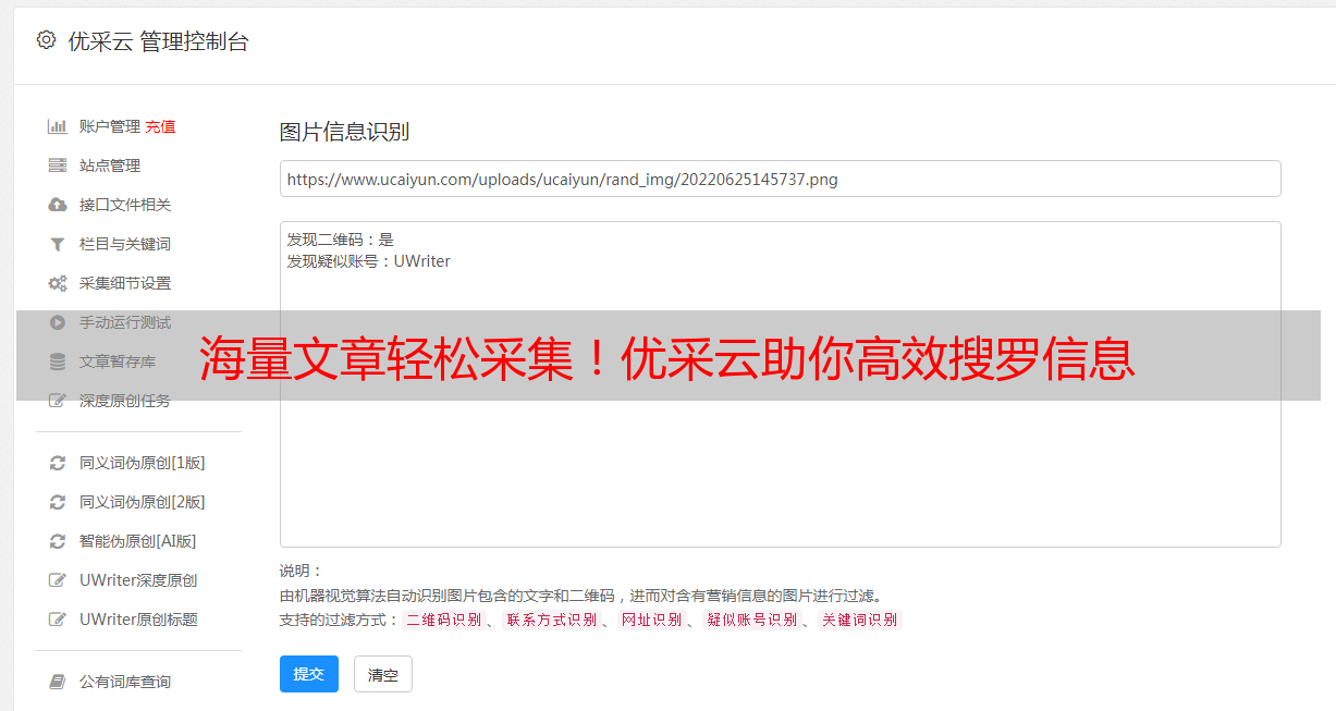除普遍可见的文章采集技术外,优采云亦投放诸多高端服务以应广大客户多元化之需求。