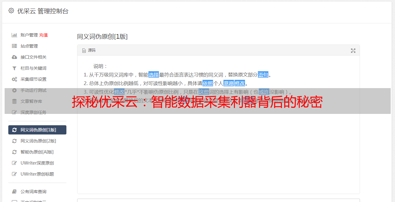 优采云,一种先进的人工智能辅助数据采集软件,通过批量快速搜集互联网信息,实现有效分析及整合。相较于传统繁琐的人工搜集方式,它能极大提升工作效率,同时有效降低人力成本,确保数据的精准度与时效性。凭借优秀的自动化特性以及高度自定义的设置选项,已成为广大企业以及个人用户处理数据时的首选工具。