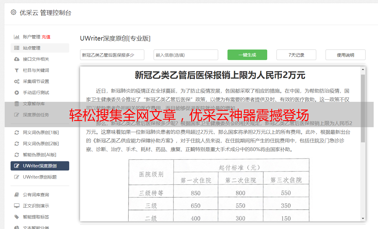 优采云,一款专注于网络数据采集的专业工具,致力于让每一位用户能够轻松且高效地抓取互联网中的各类文章内容。凭借它卓越的性能及高度灵活性,赢得众多行业用户的信赖与喜爱。借助优采云,用户得以瞬间掌握全网文章资讯,迅速收集并整合所需信息。