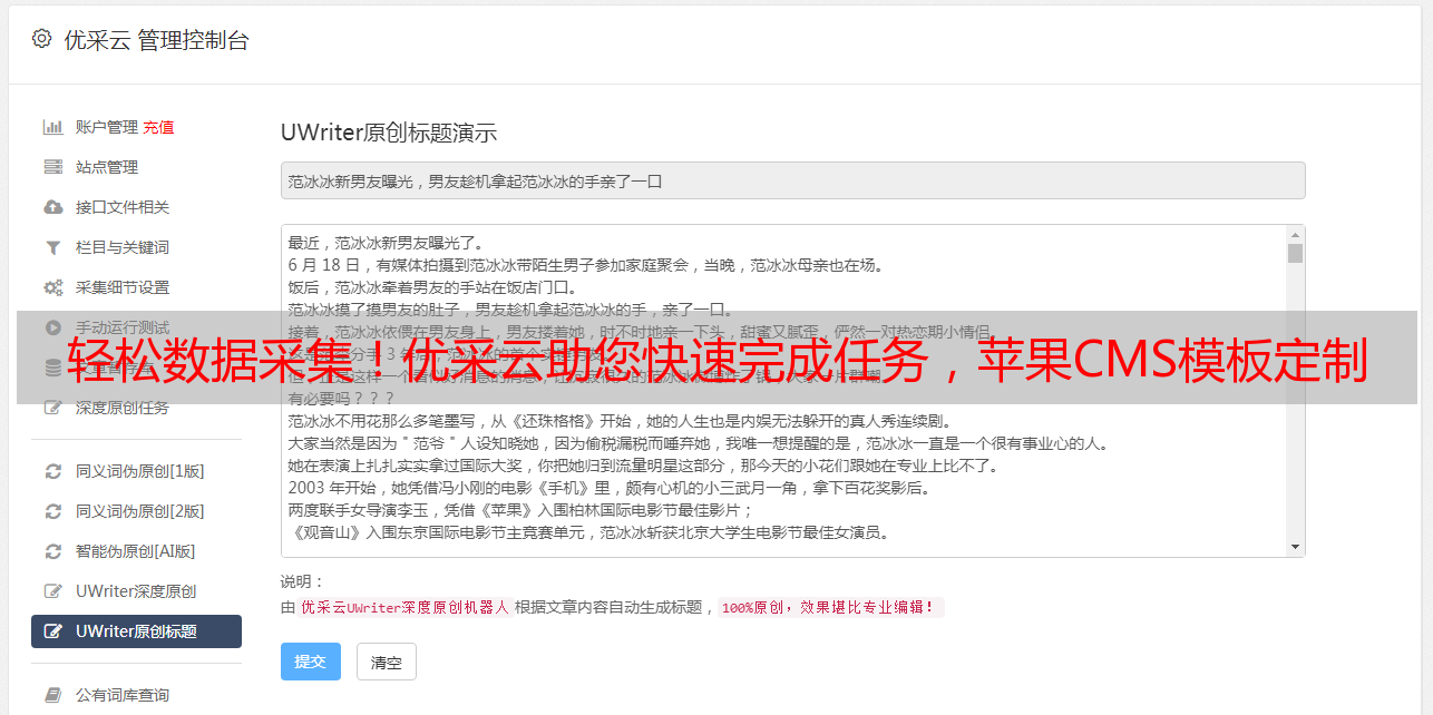 考虑到优采云应用于苹果CMS文章模板采集方面的效果显著,我们强烈建议您对数据加以定期维护与适时更新。只有这样才能保护您网站显示出的信息具有最新的时效性和全面性。若在此过程中有何不解或是需求,敬请随时向优采云专业的客户服务团队咨询与求助。